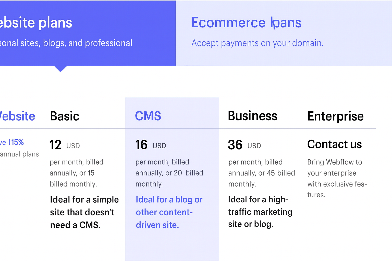 - "Site plans": These plans correspond to Webflow's e-commerce section for your online stores—you can also use CMS. So you have plans at $12 for Basic, then $16 for CMS, and finally $36 for Business. The higher your level, the more features you'll have.